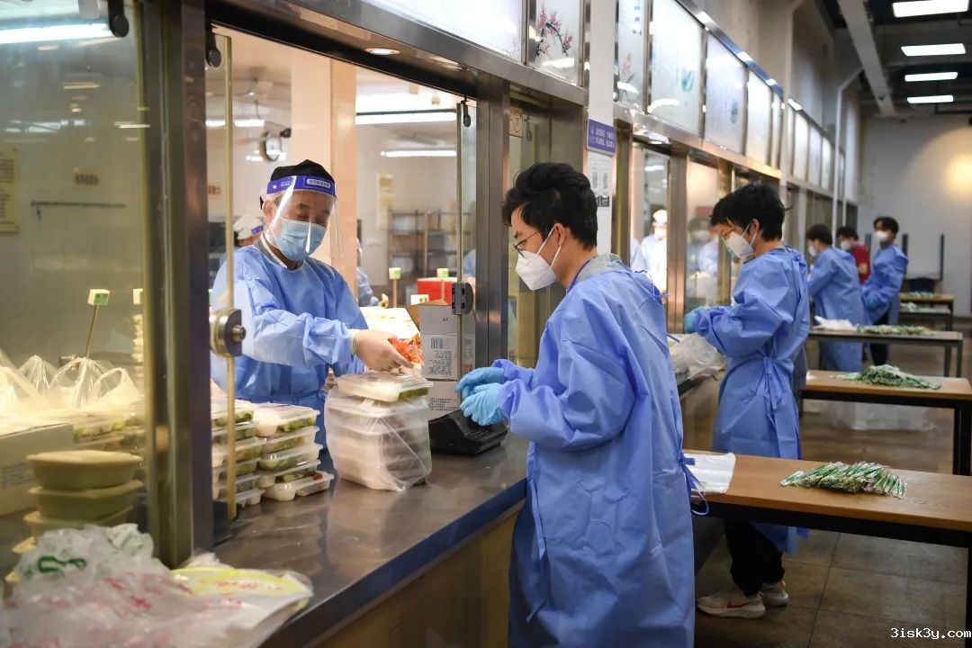 4月28日下午5时10分许,戴着“楼宇外出取餐临时出入证”的胸牌,居住在西南七楼的小杨走进了四平路校区学苑饮食广场一楼。“同学需要多少份?”在取餐窗口,师傅问道。“我们2个宿舍,一共7份。”将盒饭+火腿肠分别装进2个马夹袋,他提着盒饭,走出食堂,沿着学校划定的取餐路线走回宿舍楼。这样的取餐情景出现在几个校区的食堂。