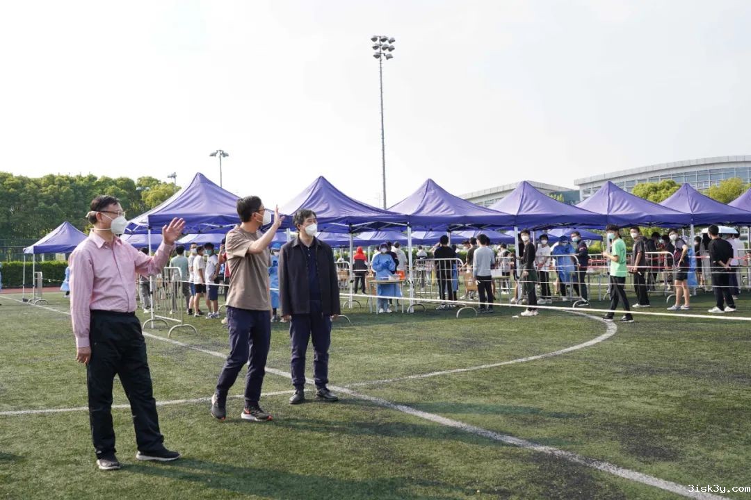 方守恩、陈杰首先来到设于人工草坪操场的核酸采样点。此时,学生正在有序排队接受核酸检测。方守恩、陈杰向同学们招手致意,向他们问好,对负责核酸采样的学校医务人员和现场志愿者同学们的辛勤付出表示感谢。