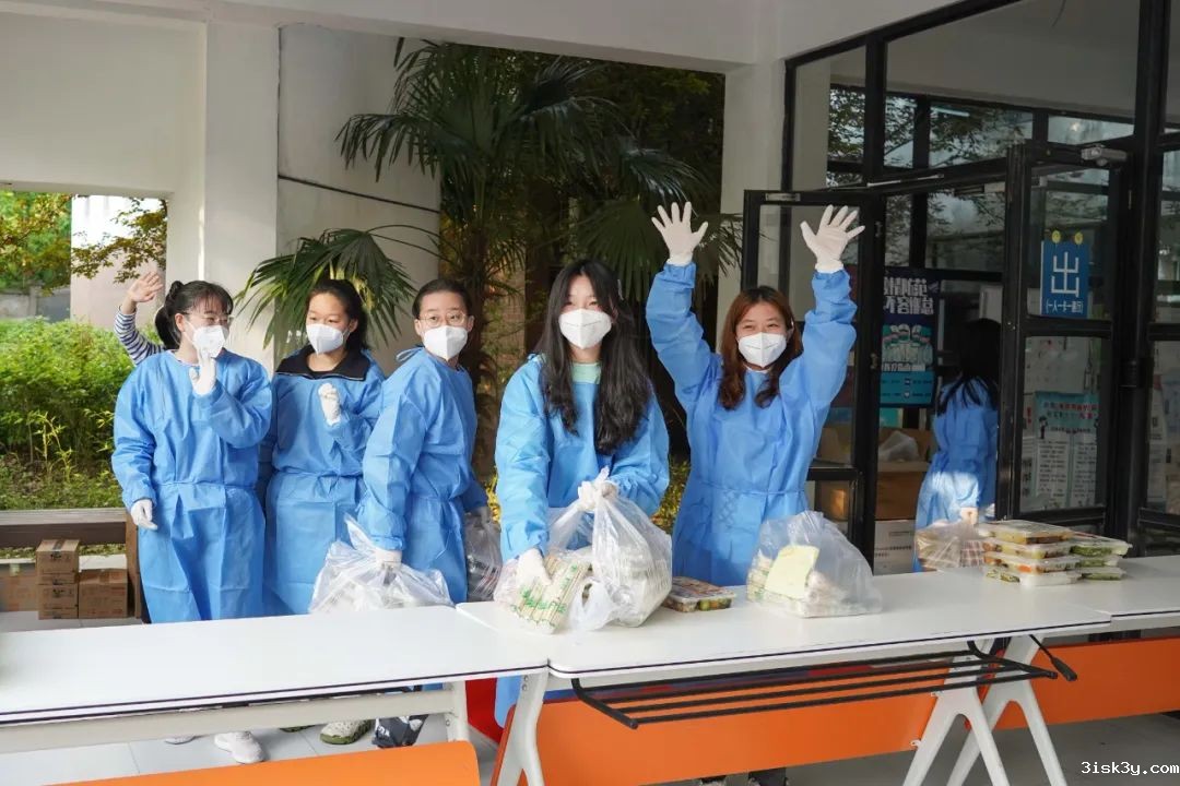 晚餐时分,方守恩、陈杰来到友园7-8号、9-10号学生社区。几位教师正开着一辆辆三轮电瓶车,从食堂给同学们送来了打好包的热乎乎的盒饭。盒饭到楼层,友园7号楼作为校区学生最多的宿舍楼,通过食堂、送餐教师和学生志愿者的高效衔接,实现了餐食集中配送到宿舍楼后半小时内分发给学生。