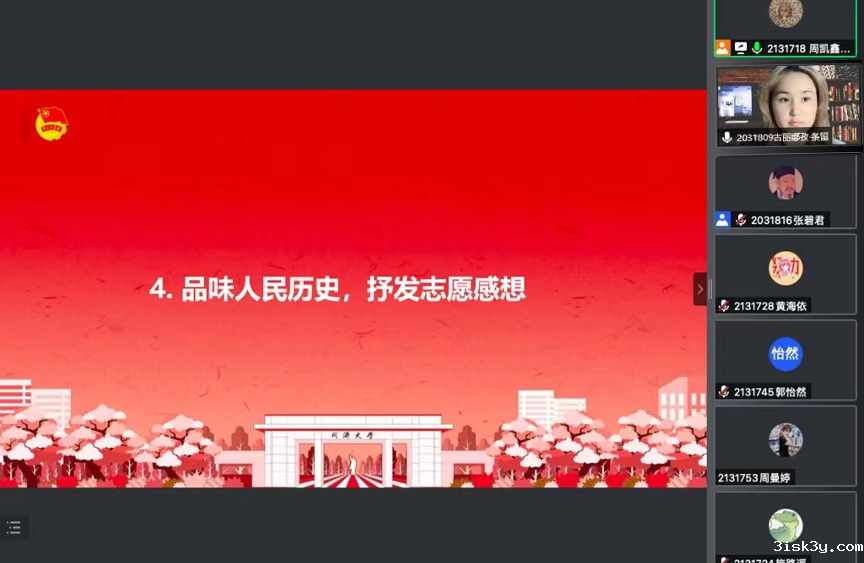 随后,2020级中文艺理班古力娜孜·条留,2021级中文艺理班郭怡然、冯霞、赵咏琦,2021级哲学班张锦、孙仲文、王燕铎7位同学分别分享了参加主题团日的感想。