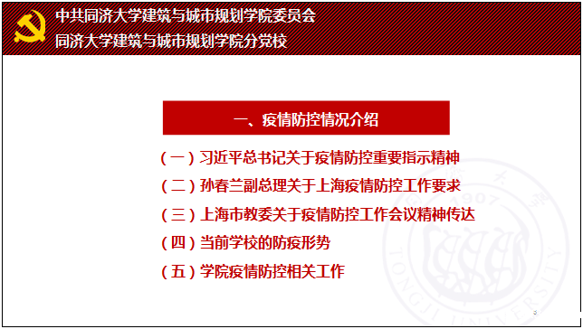 自3月以来,面对疫情防控的严峻挑战,建筑与城市规划学院党员干部带头冲锋,迎难而上。在接到中央、上海和学校疫情防控工作通知的第一时间,学院领导高度重视,立即响应,由学院党委领航,成立了疫情防控工作领导小组和多个应急工作小组,学院中层干部带头留守,靠前指挥,在倾心服务中诠释初心和担当,在坚韧坚守中传递信心和力量。