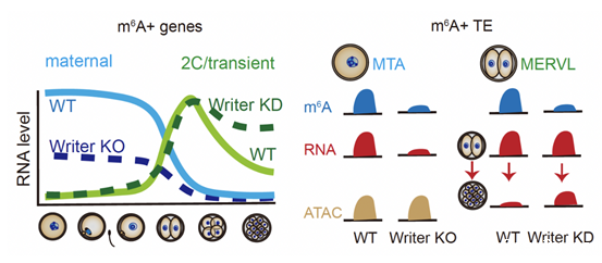为了揭示m6A对于母源和子代转录本的调控作用,研究人员利用卵母细胞特异性敲除Kiaa1429(RNA甲基转移酶复合体成员之一)的小鼠模型以及甲基转移酶METTL3抑制剂STM2457,分别获取了m6A修饰建立缺陷的卵子以及胚胎样本。研究团队发现母源转录本,包括母源转座子MTA的转录本,缺乏m6A修饰后会呈现本身丰度的显著降低(图2);有趣的是抑制ZGA转录本上m6A的建立,会引发2-4-细胞时期短暂表达的转录本如Zscan4,逆转座子MERVL无法及时降解,进而分别引发了卵子与胚胎发育的阻滞。这些结果证明转录本上的m6A修饰调控了母源转录本的维持与子代转录本的有序降解,保证了生命早期母源-子代转变的顺利发生。