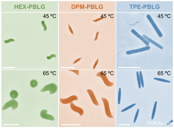 图2. 不同α-端基的PBLG在不同组装温度下形成的棒的形貌
