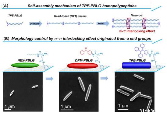 π–π互锁效应基本原理如图1A所示:聚多肽PBLG首先形成稳定的头尾相接HTT(head-to-tail)结构,然后诱导其以反向平行堆积的方式聚集,而HTT链之间的相互作用则通过PBLG分子的端基进行调控。譬如,四苯乙烯α-端基之间形成的π–π相互作用如同一把“分子内锁”,可牢牢锁住组装过程中HTT链的刚性,使其不易弯曲,从而形成具有笔直外侧面的纳米“棒杆”。团队将这种HTT链间的π–π相互作用称为π–π互锁效应。理论上,根据该效应,通过设计不同的端基就可以调控HTT链间的π–π相互作用,进而实现“磨杆成针、变针为杆”。