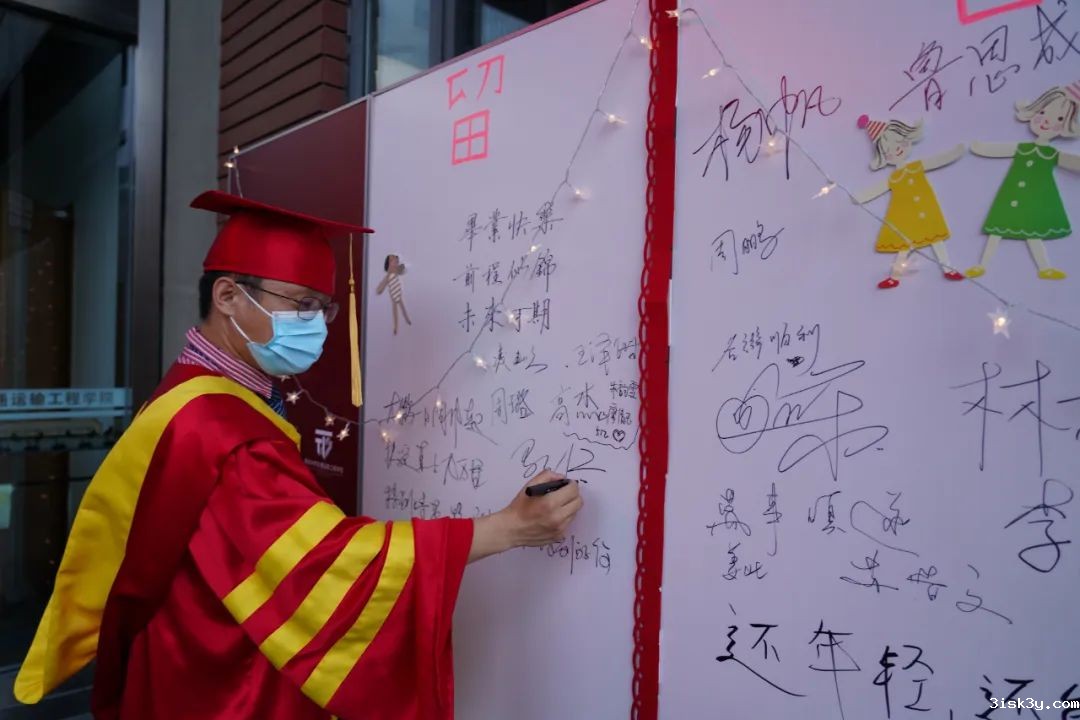 在交通运输工程学院门口特别布置的毕业留言墙前,毕业生们留言签名,抒发对学校、学院的感恩之情。老师们也在此为毕业学子送上美好祝福。留言墙成为毕业生合影打卡点之一。