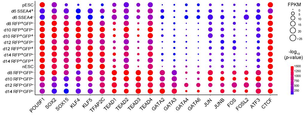 随后,团队收集不同时间点上具有不同荧光信号的细胞亚群,进行了大量的分析,发现在primed-to-naïve过程中,细胞亚群分别展示出了特异性的TE特征和PrE特征,伴随着TE基因 (GATA2、GATA3等) 和PrE基因 (GATA4、GATA6等) 的特异高表达和motif (动机)富集。后续实验结果也发现这些细胞亚群能够分别被诱导成为有功能的滋养层干细胞和胚外内胚层细胞,同时阴性细胞也能够在naïve培养条件下最终建立naïve态多能性转变为naïve态多能干细胞,充分展示了中间细胞亚群的可塑性。