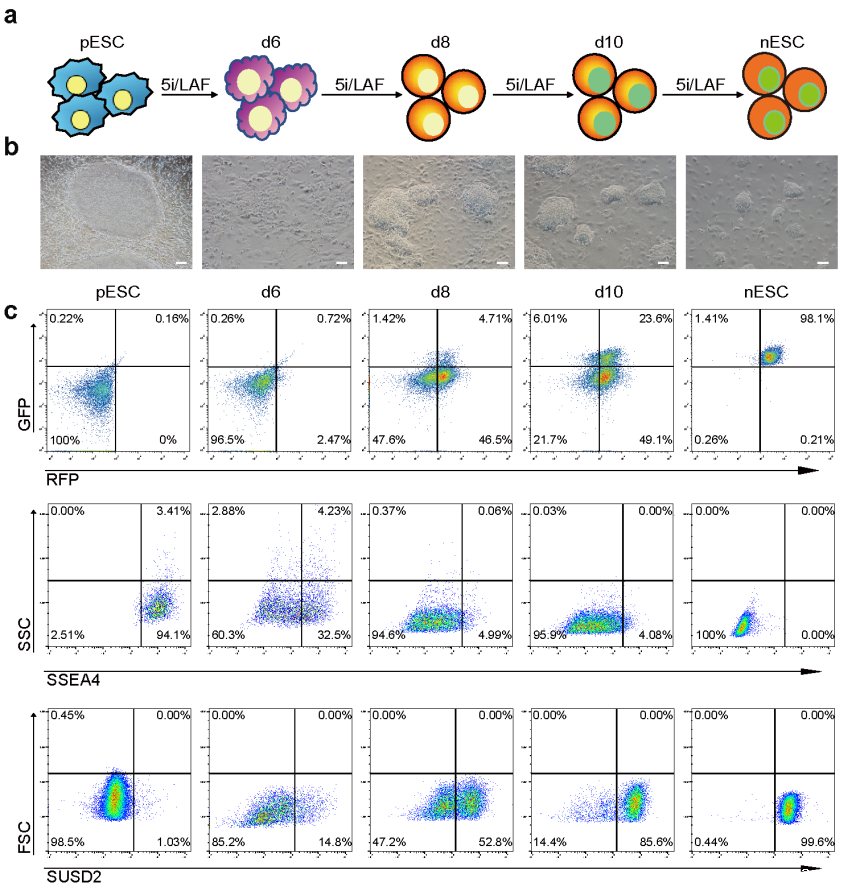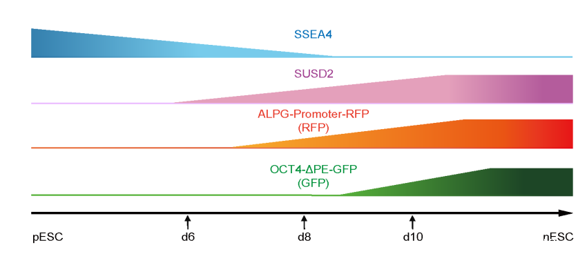 在前期研究中,研究人员鉴定了naïve态细胞特异的表面标志物ALPG蛋白,建立了ALPG-promoter-RFP报告系统,与公认的OCT4-ΔPE-GFP系统(一种基因转录系统)相整合建立了精准指征naïve态多能性的双荧光报告系统。本研究中,研究人员首先将该报告系统整合至primed态多能干细胞中诱导完成naïve态转化,并通过对过程中不同时间点的细胞进行流式分析,描绘了naïve多能性建立过程中标志分子表达动态图谱。