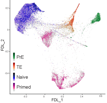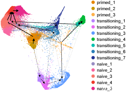 进一步,研究人员采用单细胞测序分析,同样证实在primed-to-naïve过程中出现了特异高表达TE信号和PrE信号的细胞亚群,并结合单细胞RNA速率分析和轨迹推断分析,在单细胞水平上深层次揭示了细胞亚群的动态变化和细胞命运转变图谱。