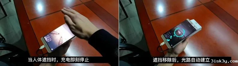 (实验展示:发送机将红外光隔空传给移动中的接收机,接收机将接收到的光能转换成电能并转发给手机。为试验方便,接收机为外置装置,将来可将其小型化集成到手机里。)