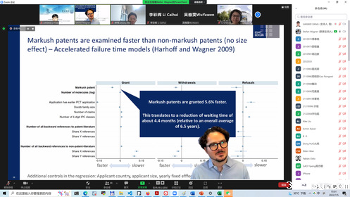 欧洲管理技术学院Stefan Wagner教授报告了其在Research Policy上新发表的论文“Mapping Markush”,探讨了马库什专利对专利审查和医药创新的影响。马库什结构是一种特殊的化学分子结构,以马库什方式撰写的专利权利要求可以保护具有相似结构的一类化学药品。学术界和产业界就马库什专利的审查负担、专利壁垒等问题存在众多争议,但是这些争议长期未能得到实证研究的检验。Wagner 教授基于大量医药专利数据,首次从实证上证明:与普遍认知不同,马库什专利并没有导致专利审查周期延长,但其确实更容易形成专利壁垒,降低后续发明专利申请的授权率。来自知名医药企业的知识产权主管和药品研发项目主管与学术界的研究者围绕Wagner 教授的报告展开了热烈的讨论。业界的专家普遍认为,目前我国对马库什专利的保护力度在平衡创新者和社会公众利益方面较为合理。尽管马库什专利对采用微调分子结构等方式进行的微型医药创新形成了壁垒,但其能够推动药企尝试开拓更多药品研发技术方向,客观上增加了社会大众能够获得的新药种类。哈尔滨工业大学(深圳)的火栋副教授、瑞典哥德堡大学的陈栗助理教授、国知院任声策教授、刘夏助理教授等围绕马库什专利的一揽子许可、企业药品研发与专利布局策略的决策机制、马库什专利审查周期等问题与Wagner教授及业内专家进行了深入交流。