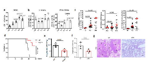 为进一步明确GXM引起隐球菌感染免疫抑制的内在机制,研究者构建了Clec2d基因敲除小鼠(Clec2d-/-),同时对比野生型WT小鼠骨髓来源MDSCs的转录组,KEGG通路富集与GSEA分析均表明MAPK通路变化显著,Clec2d-/-小鼠中p38通路激活被抑制,且使用p38抑制剂可显著降低MDSCs表达Arg-1(图3a-e)。同时,利用p38小分子抑制剂SB202190治疗小鼠肺部隐球菌感染,可显著提高小鼠生存率并降低肺部荷菌量;更有意义的是,研究者筛选了597种非专利口服药物,发现凡德他尼可体外抑制GXM诱导的p38通路激活,体内实验证明该药物同样可以显著提高隐球菌感染后小鼠存活率,促进隐球菌的清除,显著提高Th1及Th17细胞比例与功能(图3f-i)。以上结果表明GXM通过CLEC2D-p38-ARG-1信号轴激活MDSCs免疫抑制功能,同时为干预p38通路抑制ARG-1的表达从而抗新型隐球菌感染免疫治疗策略提供了理论依据。