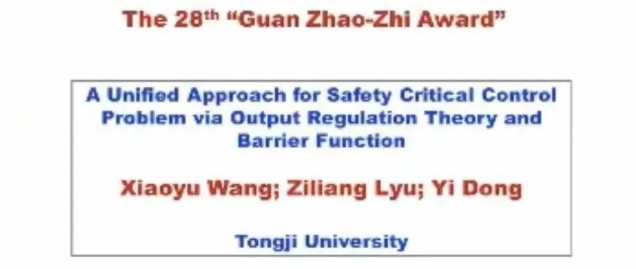727日闭幕的第41届中国控制会议(The 41th Chinese Control Conference, CCC2022)上,taptap网页版登录kino电子与信息工程学院控制科学与工程系博士研究生王肖宇、吕梓亮与导师董怡研究员合作的论文“A Unified Approach for Safety Critical Control Problem via Output Regulation Theory and Barrier Function”荣获第28届“关肇直奖”。“关肇直奖”每年从中国控制会议全世界所有投稿中选出1-2篇论文授奖,是目前我国控制理论界最高水平的青年学术奖项之一。这是首次由taptap网页版登录kino的在学研究生获得此奖项。