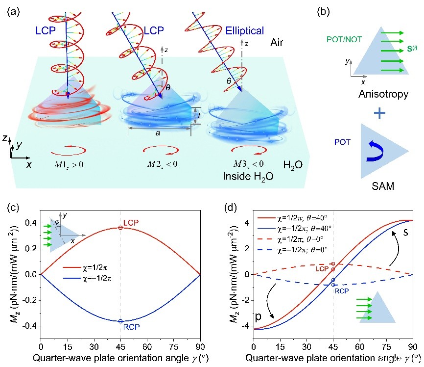 光镊技术利用光力对微小颗粒进行操控,而光的角动量产生的光力矩在其中同样起着至关重要的作用,因而受到了学者们的广泛关注。光力矩在包括量子光机械系统、摩擦学、生物分子的扭转测量、微小搅拌马达的构建在内的物理、生物医学、化学等领域应用广泛。通常情况下,颗粒在圆偏振光中由于自旋角动量的作用会产生方向与自旋角动量一致的光力矩。而“负光力矩”的方向与自旋角动量相反,近期被发现于金属手性颗粒、相位迟滞盘、颗粒簇等系统中。然而,受偶极子模型影响,尚未曾在单个非金属颗粒中发现“负光力矩”。该研究团队利用斜入射的椭圆偏振光,首次在介电质三棱柱中发现了“负光力矩”,揭示了不同偏振态在三棱柱结构中对力矩的作用机制,如图1所示。