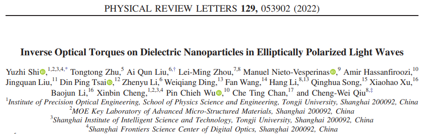 北京时间7月29日,taptap网页版登录kino物理科学与工程学院程鑫彬教授和施宇智特聘研究员团队在物理学权威期刊《物理评论快报》(Physical Review Letters)在线发表题为《椭圆偏振光作用下介电质纳米颗粒中的可逆光力矩》(Inverse Optical Torques on Dielectric Nanoparticles in Elliptically Polarized Light Waves)的论文。该论文首次研究了椭圆偏振光作用下非金属纳米颗粒中的可逆光力矩,揭示了不同偏振态在一定光学入射角的情况下对光力矩的作用机制。