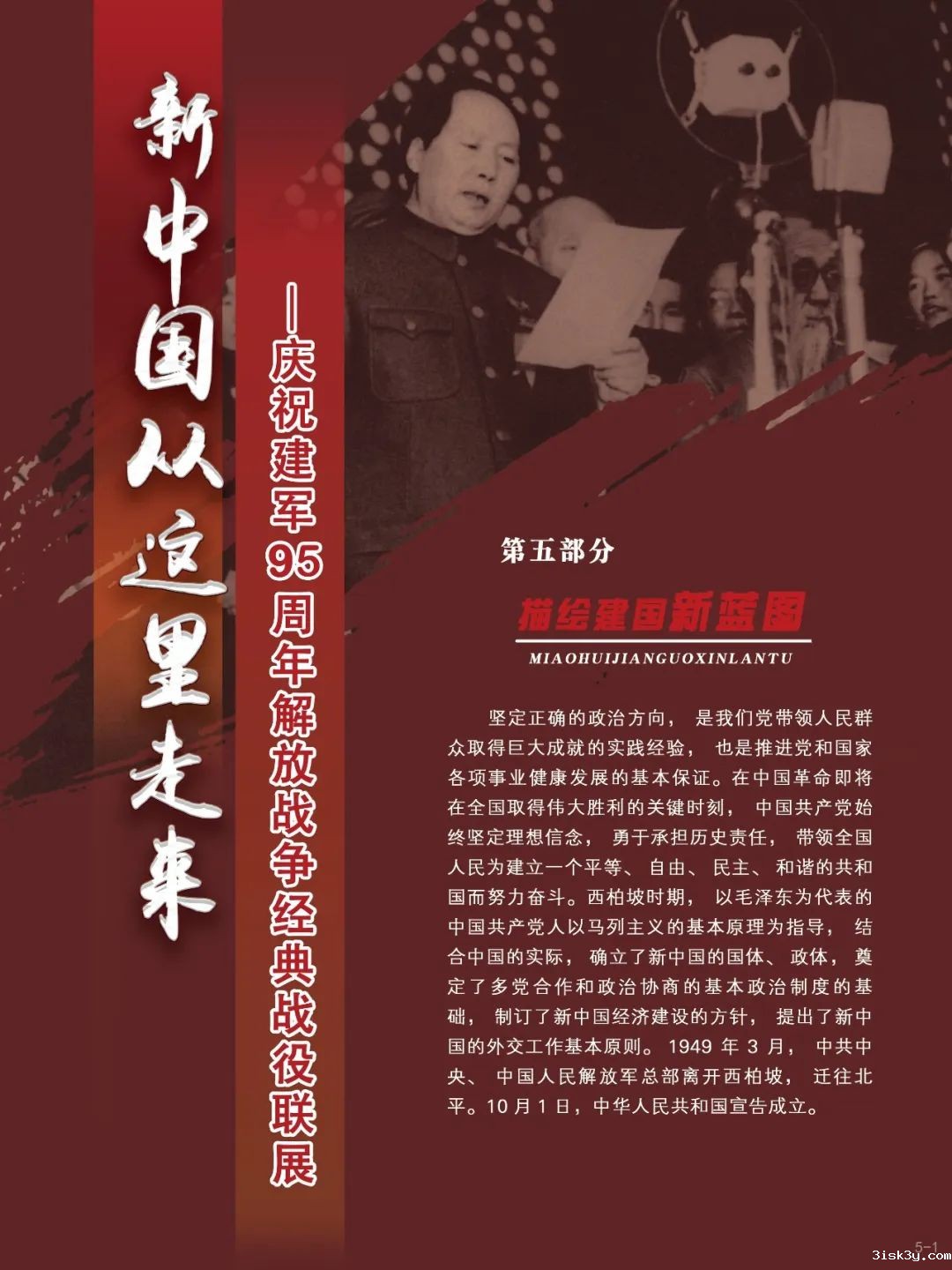 第五部分“描绘建国新蓝图”,展现了党中央在西柏坡为迎接新中国成立构建的宏伟蓝图,新中国从西柏坡走来。