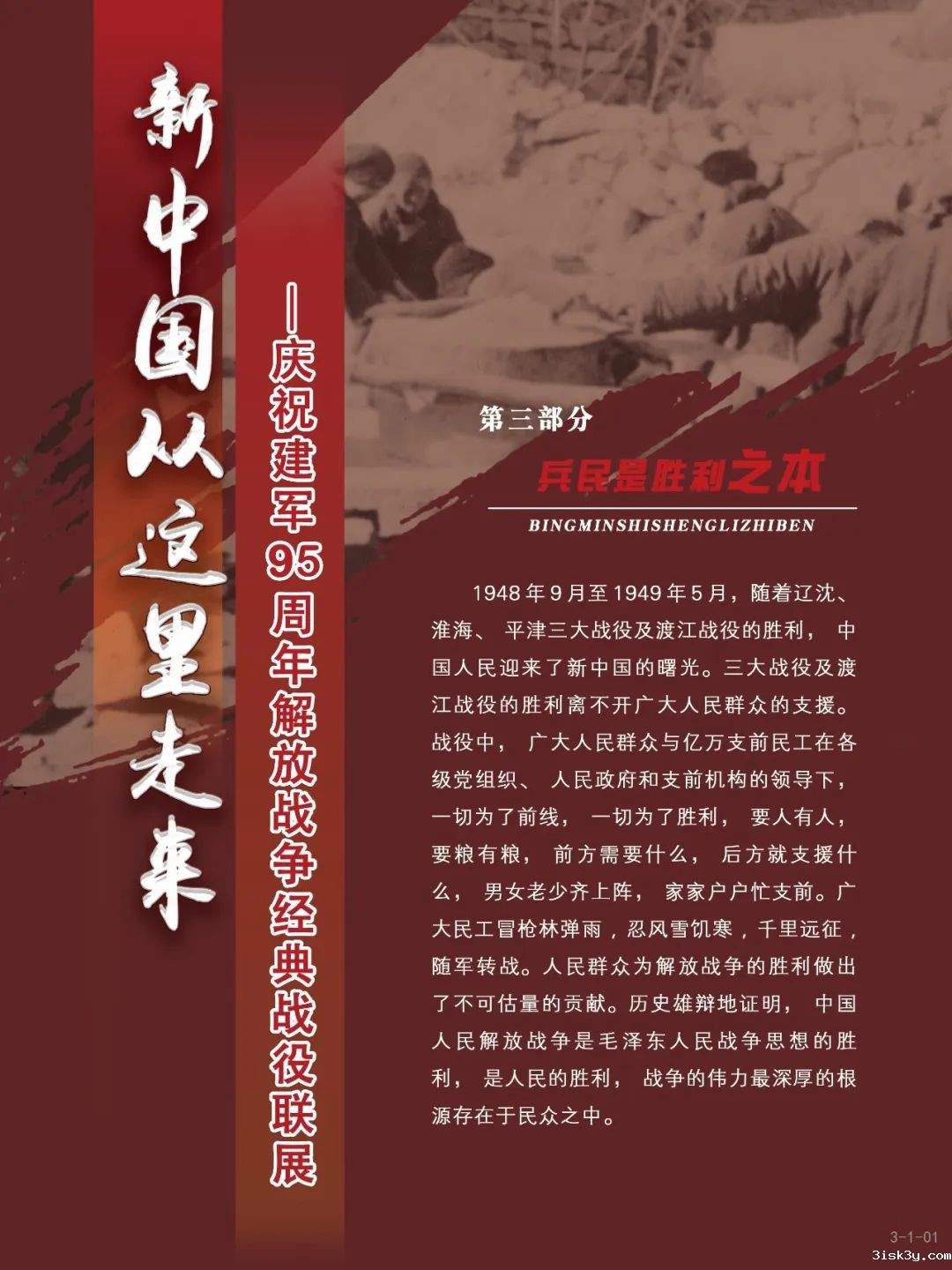 第三部分“兵民是胜利之本”,再现了在中国共产党的领导下,形成了百万人民支援前线的感人场面,保障了各个战役的伟大胜利。