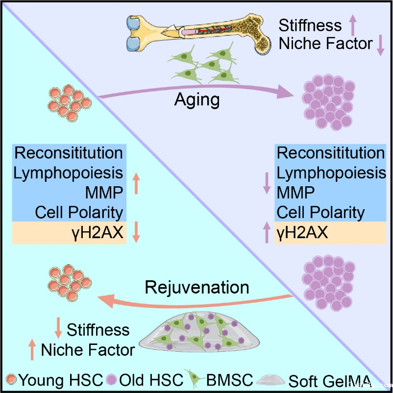 综上所述,该研究揭示了基质硬度在调控骨髓造血微环境中的关键作用,并应用该原理在体外成功构建了柔软的年轻骨髓微环境用于HSC的维持和年轻化。此外,该研究还发现骨髓硬化是造血系统衰老的重要标志物(图1)。这一研究成果表明通过改变骨髓微环境逆转HSC衰老是一种行之有效的方法,从而为改善HSC质量、逆转机体系统性衰老和治疗重大血液疾病提供了创新策略。