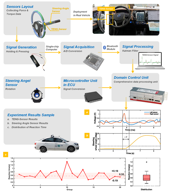 对此,我校学生团队着眼于汽车人机交互关键技术,基于自主设计的摩擦电纳米传感器搭建了一套面向人机共驾协同控制的智能交互系统。通过将这种低成本、高灵敏度、自供电的传感器布置在方向盘外周,实时采集并提取驾驶员握持方向盘时的电信号波形特征,实现对驾驶行为的监测。模型实验证明,系统能够平均提前0.58s实现对驾驶员转向意图的超前预测。