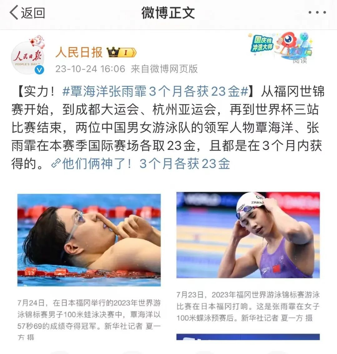 从福冈世锦赛开始到成都大运会、杭州亚运会,再到世界杯三站比赛结束,作为中国游泳队的领军人物之一,同济学子覃海洋在本赛季国际赛场获得了23金且都是在3个月内获得的。