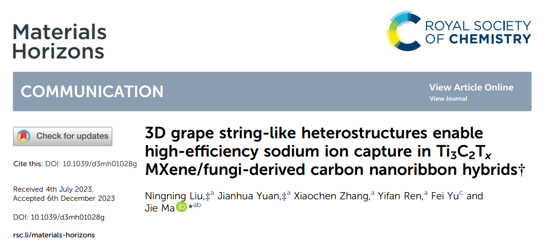 近日,国际权威刊物《材料视野》(Materials Horizons)在线发表了环境科学与工程学院马杰教授团队的研究论文“3D Grape String-like Heterostructure Enable High-Efficiency Sodium Ion Capture in Ti3C2Tx MXene /Fungi-Derived Carbon Nanoribbons Hybrids”。