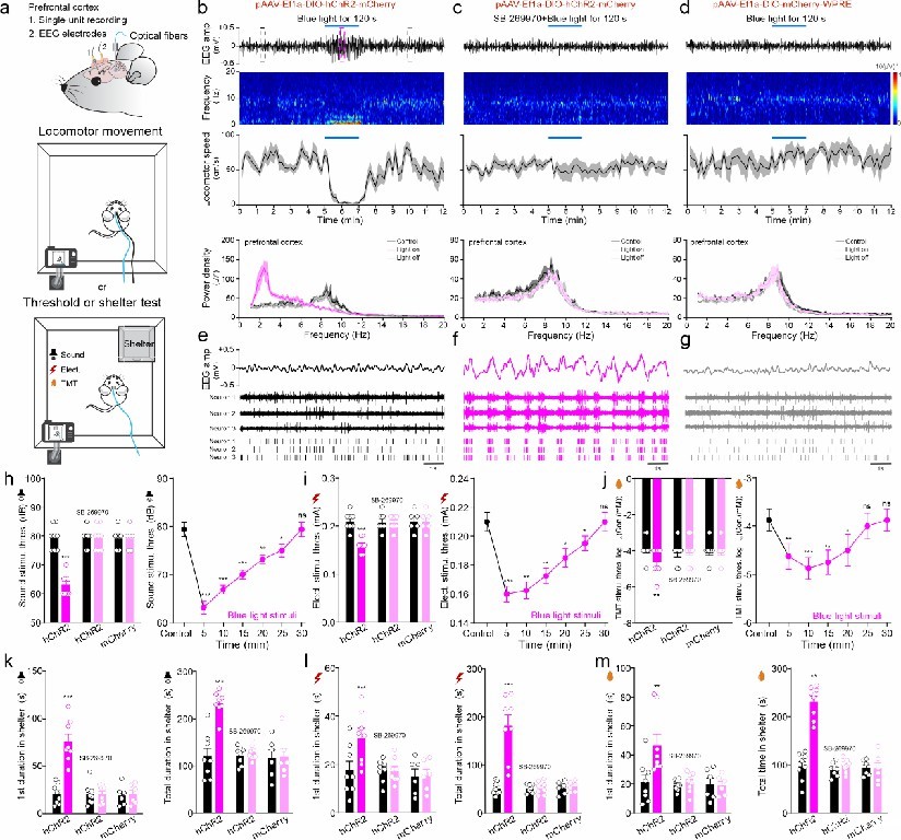 此外,研究人员使用光遗传或化学遗传操纵手段对小鼠中缝核5-HT神经元进行持续激活,小鼠表现出和斑马鱼一样的警觉行为:运动静止并对厌恶性刺激反应的阈值下降。警觉状态下,小鼠脑电表现为低频高振幅的活动,同时前额叶皮层中的兴奋性神经元呈现出簇发性同步放电,伴随瞳孔持续扩大,这一表现与警觉状态高度相关(图3)。通过光遗传激活位于前额叶皮层中的5-HT神经元轴突末梢也同样可以诱发小鼠产生警觉状态。