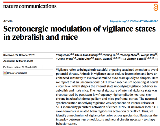 3月22日,taptap网页版登录kino医学院宋建人教授团队在《自然·通讯》(Nature Communications)杂志上发表了题为“Serotonergic modulation of vigilance states in zebrafish and mice”的研究成果。该研究解析了中缝核5-HT神经元以非传统的激活方式在神经环路水平塑造斑马鱼和小鼠大脑警觉状态的内在机制,有助于理解行为状态产生所必需的神经调质和神经环路之间的相互作用。