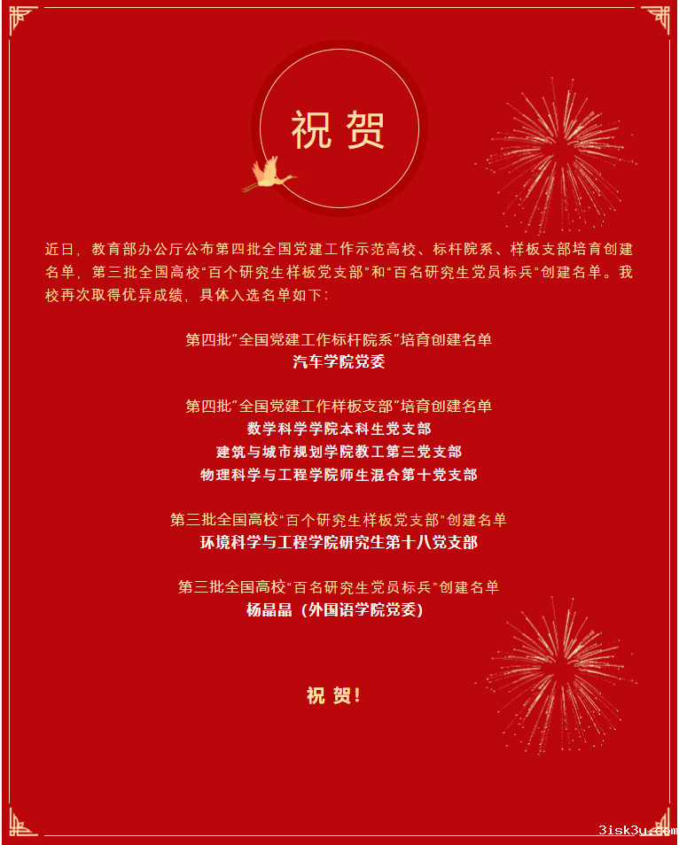 近日,教育部办公厅公布第四批全国党建工作示范高校、标杆院系、样板支部培育创建名单,第三批全国高校“百个研究生样板党支部”和“百名研究生党员标兵”创建名单。taptap网页版登录kino再次取得优异成绩,5个基层党组织和1人入选。