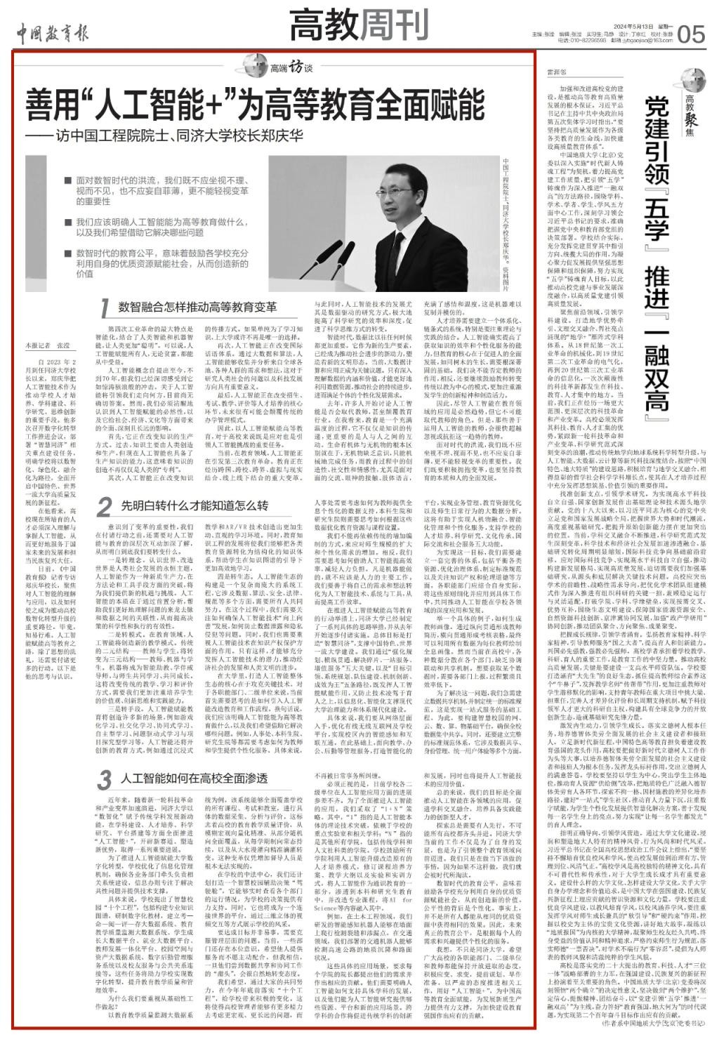 今天(5月13日),《中国教育报》“高教周刊”头条刊发了taptap网页版登录kino校长、中国工程院院士郑庆华的专访文章,题为《善用“人工智能+”为高等教育全面赋能》。