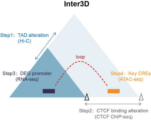 Inter3D分析方法用于分析顺式转录调控元件(cis regulatory element,CRE)与基因启动子间的相互作用。TAD重构存在两种不同机制,即Intra-TAD(Mechanism 1,CTCF促进启动子–CRE相互作用)或Inter-TAD(Mechanism 2,CTCF阻碍启动子–CRE相互作用),在调控基因转录方面发挥着关键作用。Inter3D首先使用Hi-C和CTCF ChIP-seq数据集来识别CTCF介导的TAD边界变化,并结合RNA-seq数据集识别出由CTCF结合变化和TAD重构调控的显著差异表达基因(differentially expressed genes,DEGs),再通过ATAC-seq数据集的叠加,在启动子远端的峰值中识别候选增强子,排除仅受三维结构而非增强子调控的假阳性靶基因。通过Inter3D方法,该研究成功计算出基于Inter-TAD(Mechanism 1)的8个癌基因和28个抑制基因,以及基于Intra-TAD(Mechanism 2)的11个癌基因和26个抑制基因。