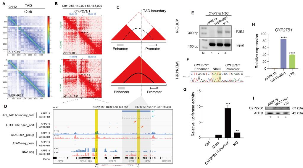 此外,与ARPE19细胞相比,WERI-RB1细胞12号染色体上的促癌基因CYP27B1位点发生TAD融合现象,使得CYP27B1的启动子(P2)和增强子(E2)共存于同一个TAD中,形成特异性染色质环,导致肿瘤细胞中CYP27B1转录上调。