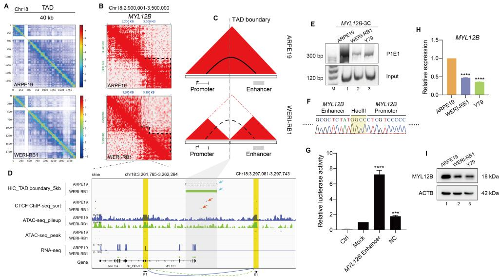 为了进一步检测Inter3D方法的准确性,该研究挑选了抑癌基因MYL12B和促癌基因CYP27B1。40 Kb分辨率结果显示,相较于正常细胞ARPE19,在肿瘤细胞WERI-RB1中,18号染色体上的MYL12B基因座处存在一个新生TAD(neo-TAD)边界,发生TAD分离现象,导致MYL12B启动子(P1)与其下游增强子(E1)之间染色质环特异性丢失,引起WERI-RB1细胞中MYL12B转录水平显著降低。
