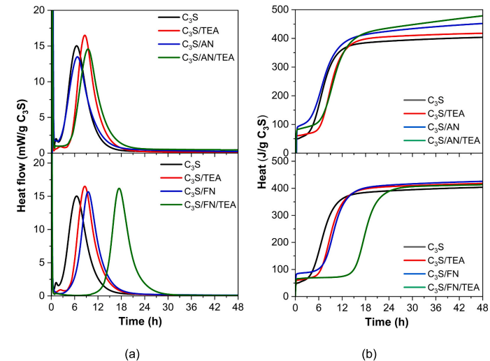 Fig. 2 含与不含TEA的硝酸铝(AN)和硝酸铁(FN)对C3S水化的影响(a)放热速率和(b)累计放热量