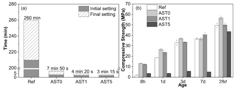 喷射混凝土广泛用于地下隧道的支护工程中。无碱速凝剂是实现喷射混凝土性能的关键外加剂,其主要功能组分为硫酸铝(AS)。AS的加入能够提高混凝土的早期强度,但是混凝土早期强度的主要来源尚未完全明晰。此外,作为无碱速凝剂的另一主要组分,醇胺类外加剂能够提高AS的溶解度并进一步缩短混凝土的凝结时间,但由于其敏感性较强,限制了进一步应用。尽管诸多研究聚焦于AS或者TEA单掺对水泥水化的影响,但AS与TEA的协同作用机制仍未清晰认知。