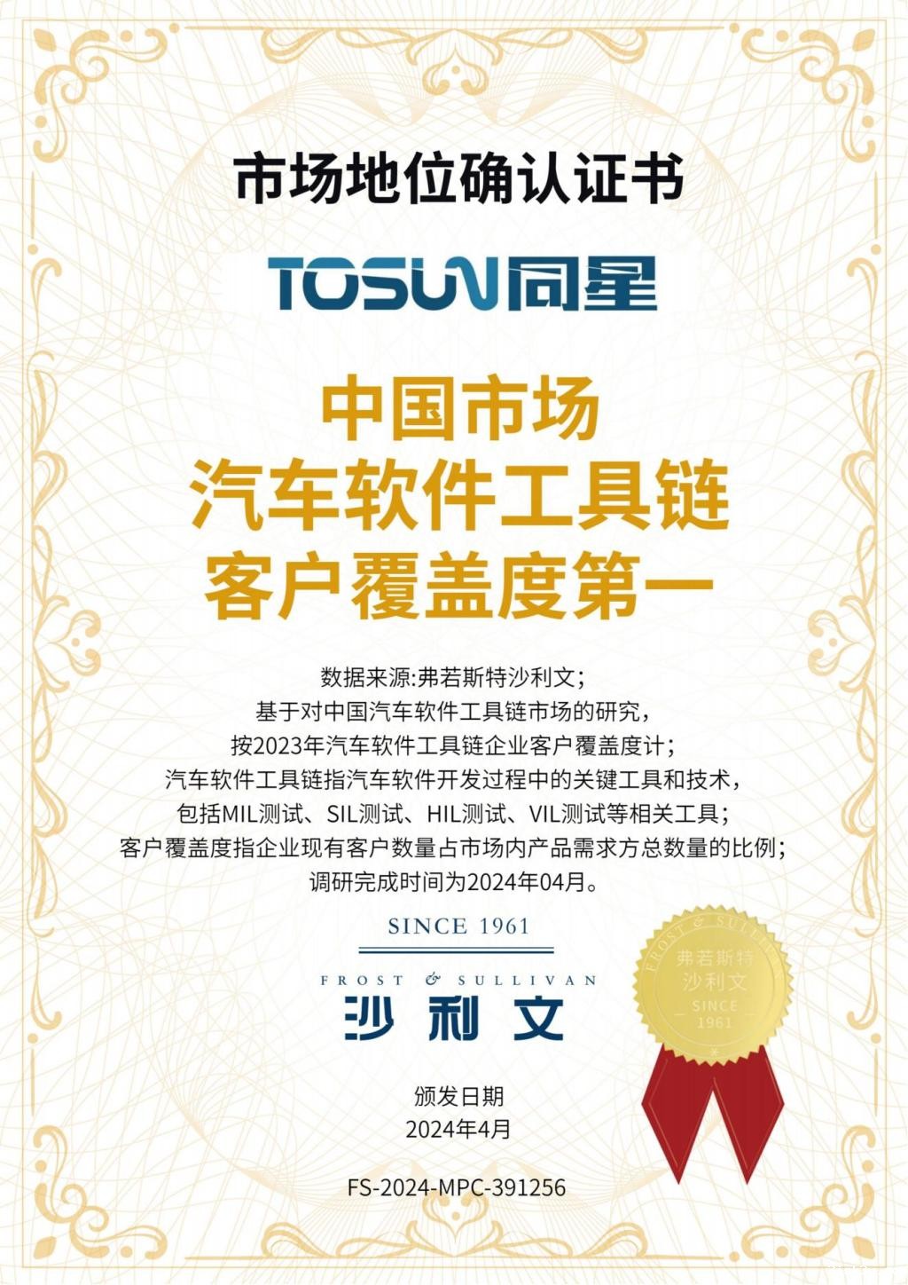 近日,全球性增长咨询公司沙利文发布市场地位确认证书,上海同星智能科技有限公司被认定为中国市场汽车软件工具链客户覆盖率第一。