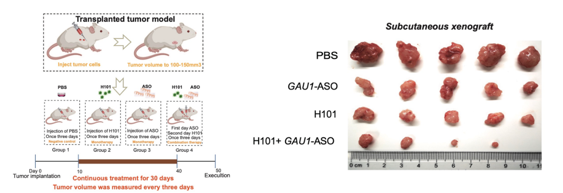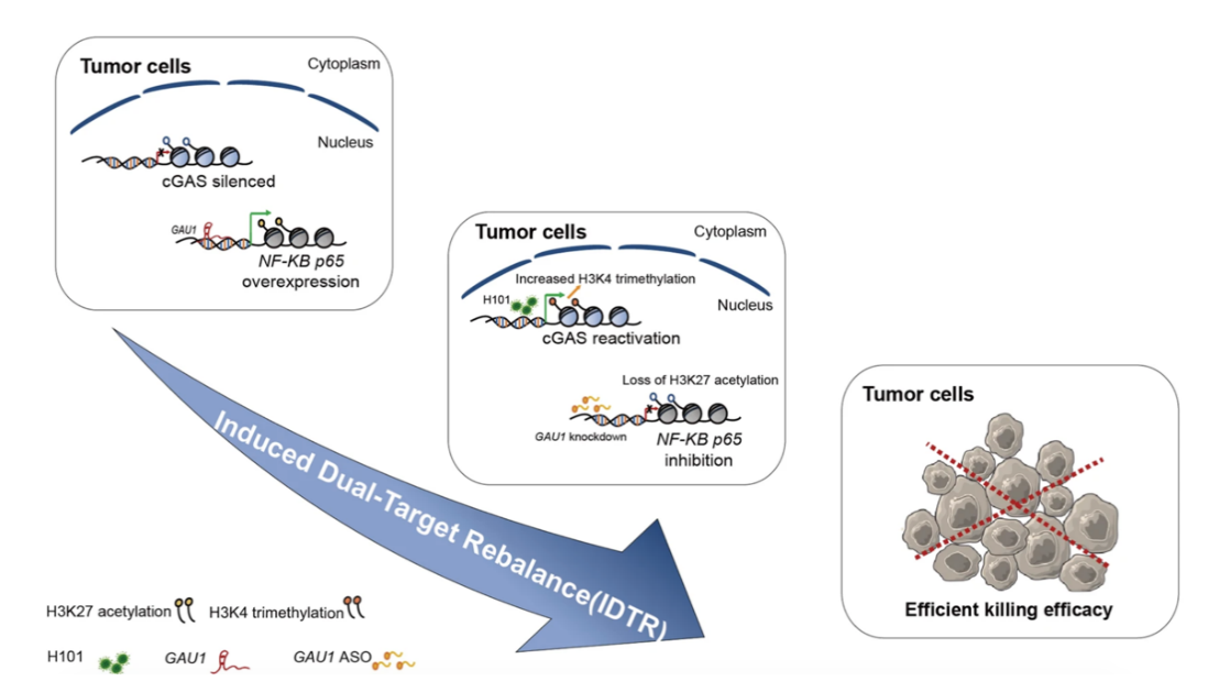 该研究以同时具有cGAS异常失活和NF-κB p65过度激活的结直肠癌作为研究对象,研究发现,一方面,溶瘤腺病毒H101感染肿瘤细胞后,能重新激活肿瘤细胞中异常沉默的cGAS,另一方面,利用反义寡核苷酸特异沉默GAU1 lncRNA能抑制肿瘤中NF-κB p65过度激活。在此基础上,使用溶瘤腺病毒H101和GAU1反义寡核苷酸联合处理肿瘤细胞,与单独处理相比,肿瘤细胞增殖速率下降了62–77%。在小鼠移植瘤模型中,联合处理组的肿瘤生长抑制率达到了88%,肿瘤重量减少了86%,取得十分显著的肿瘤杀伤效果。此外,在联合抗肿瘤杀伤药理机制上,研究发现溶瘤腺病毒H101能通过促进cGAS启动子上的H3K4三甲基化来重新激活cGAS,GAU1反义寡核苷酸则通过降低NF-κB p65启动子上H3K27乙酰化抑制NF-κB p65过度激活。