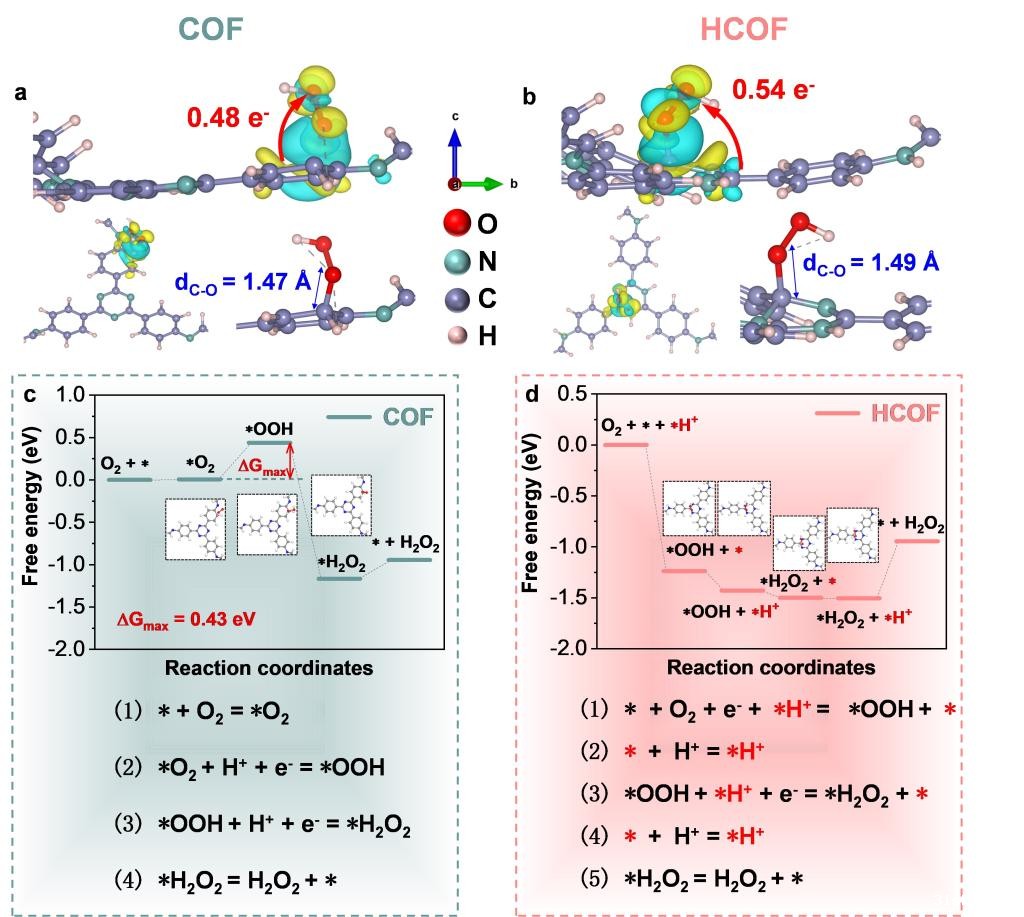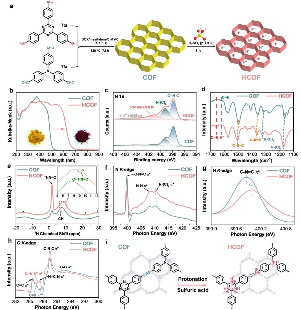 以亚胺连接的COF为例,该项研究证明了功能单元(如亚胺、胺和三嗪)的质子化是提高H2O2合成活性水平的高效策略。实验证实质子化不仅扩大了COF的光吸收,而且提供了直接参与H2O2生成的质子源。在这一过程中,质子化简化了ORR生成H2O2的反应途径,即从间接超氧自由基(