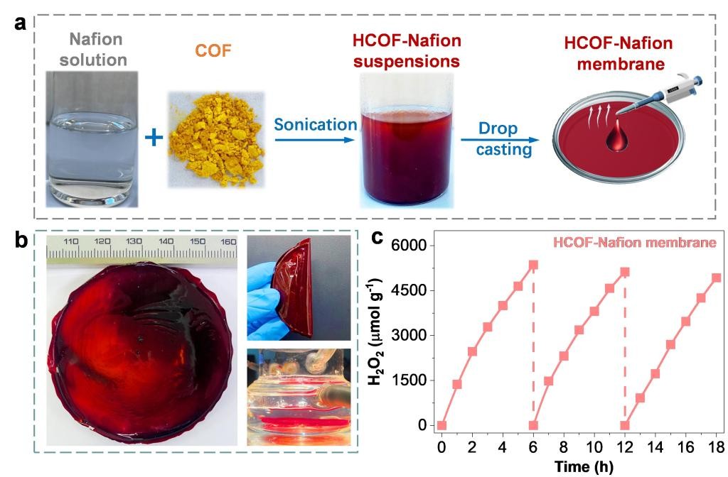 作为质子化策略的概念验证,研究人员使用Nafion膜溶液作为质子源和粘合剂来制造HCOF-Nafion膜,所形成的膜在O2饱和去离子水(pH = 7)中能够高效合成H2O2,且稳定性高,可重复使用,进一步证明了质子化策略的有效性以及它在实际应用中的良好适用性。