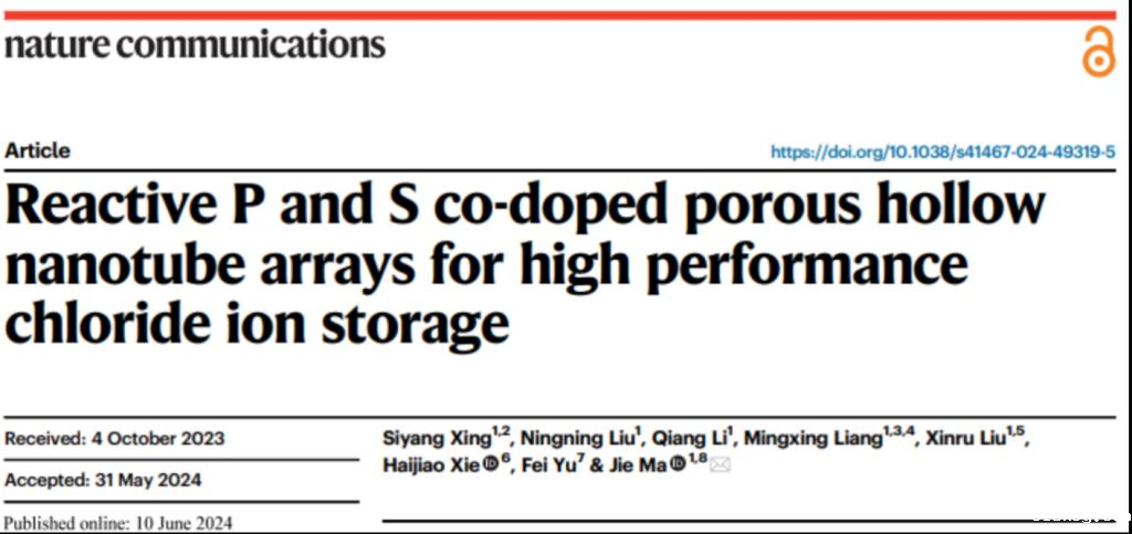 近日,环境科学与工程学院马杰教授团队在国际权威学术刊物《自然·通讯》(Nature Communications)上发表题为“Reactive P and S co-doped porous hollow nanotube arrays for high performance chloride ion storage”的研究成果。该研究通过掺杂一步实现高位点反应活性及高速离子扩散通道的建立,揭示了过渡金属磷硫化物在电化学捕氯中强大的应用前景,也为脱氯阳极的设计提供普适性的策略和方法。