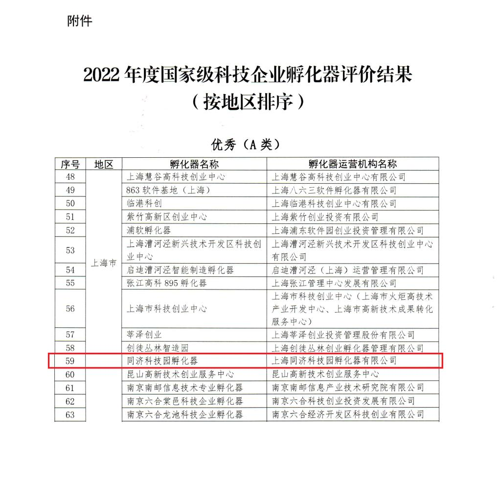 为充分发挥优质科技企业孵化器引领示范作用,推动创业孵化载体规范化、体系化、专业化建设,根据《科技企业孵化器管理办法》和《科技企业孵化器评价指标体系》相关要求,工业和信息化部火炬高技术产业开发中心开展了2022年度国家级科技企业孵化器评价工作。经年度统计数据和年度工作总结上报、定量计算评价、专家定性评价和地方管理评价等综合评定,工业和信息化部火炬高技术产业开发中心近日公布了2022年度国家级科技企业孵化器评价结果,同济科技园孵化器再次获评优秀(A类)国家级科技企业孵化器。
