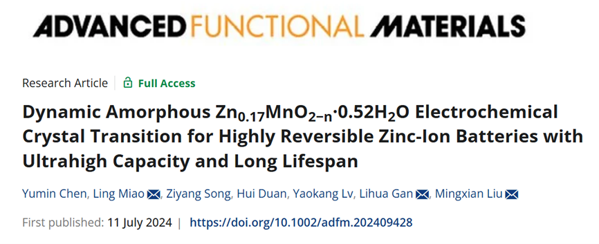 化学科学与工程学院刘明贤与甘礼华团队通过电化学氧化诱导预相变策略实现高度可逆锌离子存储,研究成果发表于《先进功能材料》