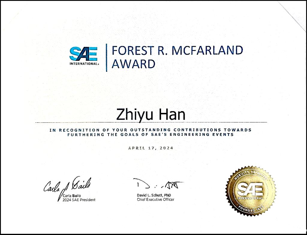 汽车学院韩志玉教授荣获国际自动机工程师学会Forest R.McFarland奖