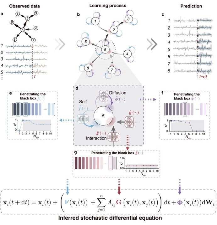 图1:LaGNA推理框架示意图。(a)输入观测数据;(b, d)构建信息传递的图结构,并在各节点和连边上分别嵌入的神经网络模块;(c)通过训练使该架构具有对随机系统演化的预测能力;(e-g)最后利用稀疏辨识技术打开各神经网络模块的黑盒子,得到隐含的随机微分方程组,实现可解释推理。