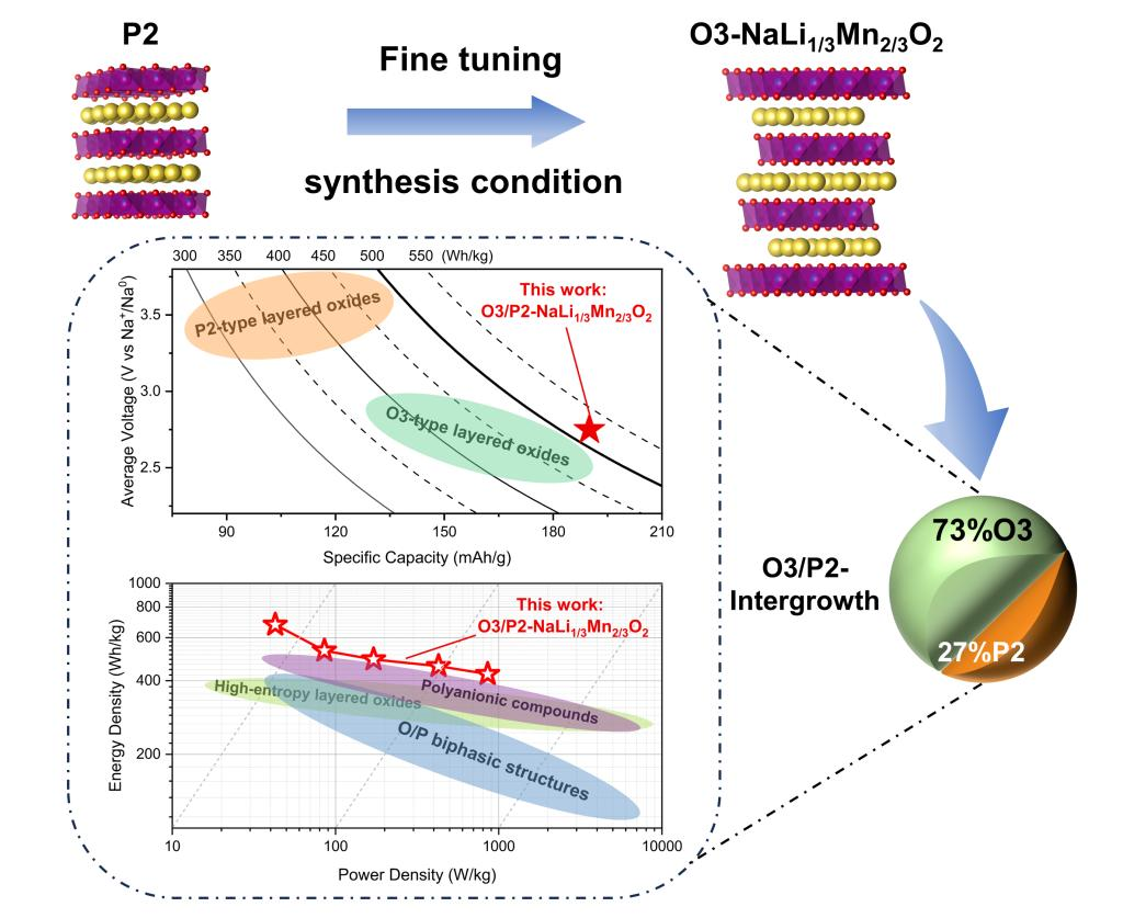 钠离子电池在近年来得到了快速发展,尤其是正极材料组分被广泛研究。其中层状过渡金属氧化物兼有低成本与高性能特点,被认为是极具潜力的商用正极材料之一。围绕如何提高这类材料的比容量和倍率性能,taptap网页版登录kino材料科学与工程学院马吉伟教授团队提出了一种新的解决方案,即通过调整合成条件控制了O3-NaLi1/3Mn2/3O2中P2的共生比例。7月16日,相关研究成果以“Enhancing Reversibility and Kinetics of Anionic Redox in O3-NaLi1/3Mn2/3O2 through Controlled P2 Intergrowth”为题发表于《德国应用化学》(Angewandte Chemie International Edition)。