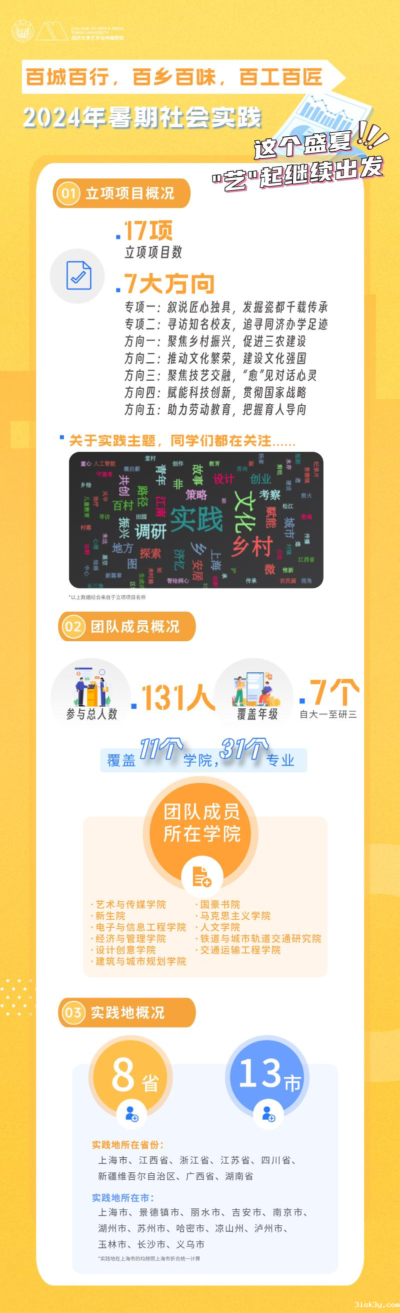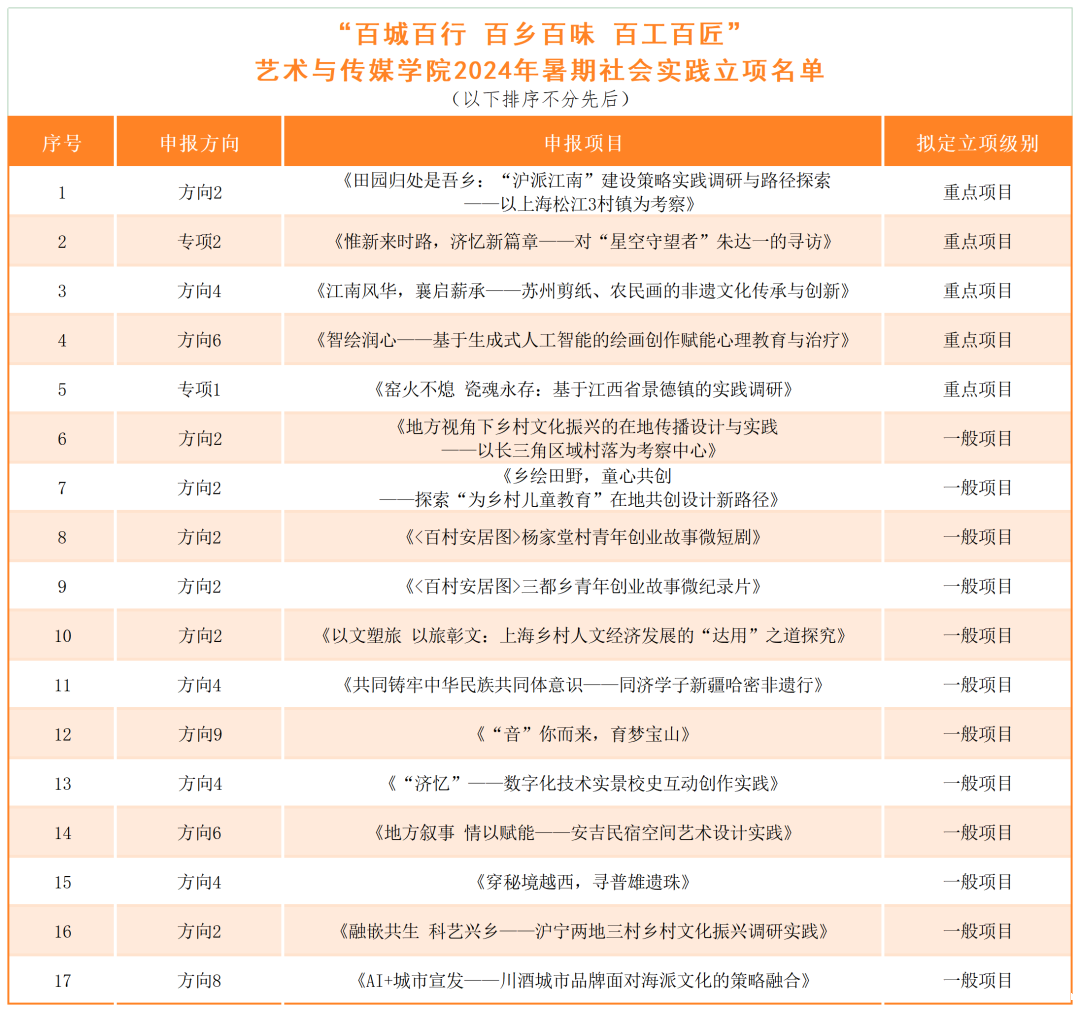 为学习贯彻习近平新时代中国特色社会主义思想和党的二十大精神,以习近平总书记关于青年工作的重要思想为指引,增强新时代社会实践活动实效、深化实践育人工作、持续深耕学院“纪录城乡”实践品牌,引导广大专业学子在“社会大课堂”中感知理论知识与实践发展的有机联系,从党的伟大奋斗和历史经验中汲取前进动力,从城乡融合发展、社会治理一线、工艺匠造前沿汲取成长智慧,艺术与传媒学院统筹部署,在已取得的特色专项实践丰硕成果基础上赓续有为、再书新篇,特开展“百城百行,百乡百味,百工百匠”2024年暑期社会实践,鼓励学院广大专业学子进一步发挥优势特长融入城乡发展大局,找准青春可为的切入点、把握专业所向的着力点,让青春在全面建设社会主义现代化国家的火热实践中绽放绚丽之花。其中,17个项目获得立项,并开启火热的实践之旅。