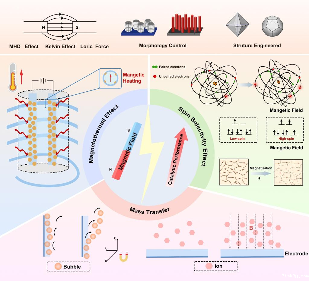 宏观上,磁场通过提升质量传输(气泡管理和离子传输)等方面,显著增强了电催化性能。磁场通过洛伦兹力促进离子和电荷的传输,改善反应物和产物的扩散效率。此外,磁场还能够与电子自旋状态协同作用,优化反应路径,提高催化效率。磁热效应通过在催化剂表面产生局部加热,也可以显著提高了催化剂的活性和反应效率。