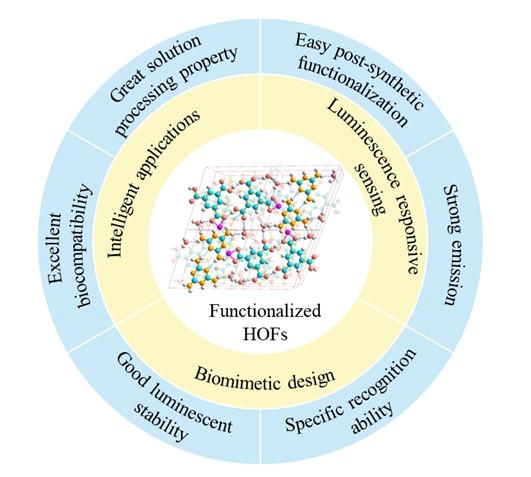 氢键有机框架(Hydrogen-bonded organic frameworks, HOFs)作为一种新兴的晶态多孔材料,主要由纯有机或金属有机构建单元通过氢键相互作用构筑而成,框架可通过范德华力、静电、π-π、C-H…π相互作用等进一步强化。功能化氢键有机框架是指通过离子交换、配位后合成修饰和原位合成等策略将外来功能物种引入HOFs框架以赋予其特定功能的杂化材料。发光功能化HOFs可以产生丰富的发光中心,能对特定的分析物或刺激表现出敏感的光响应变化(开、关或比率变化)。这些特性使功能化HOFs材料和器件能够实现对各种化学刺激甚至物理刺激的传感。taptap网页版登录kino化学科学与工程学院闫冰教授团队自2021年开辟了基于功能化HOFs特别是镧系功能化HOFs杂化材料在光功能应用、光响应传感、智能检测与仿生模拟方面的系统工作,相继在Adv.Mater、Adv.Funt.Mater.等国际重要期刊发表研究论文20余篇。基于前期系统性工作,该团队近日在国际知名期刊《材料研究述评》(Accounts of Materials Research)上发表题为“Lanthanide Functionalized Hydrogen-bonded Organic Framework Hybrid Materials: Luminescence Responsive Sensing, Intelligent Applications and Biomimetic Design”的综述性文章。