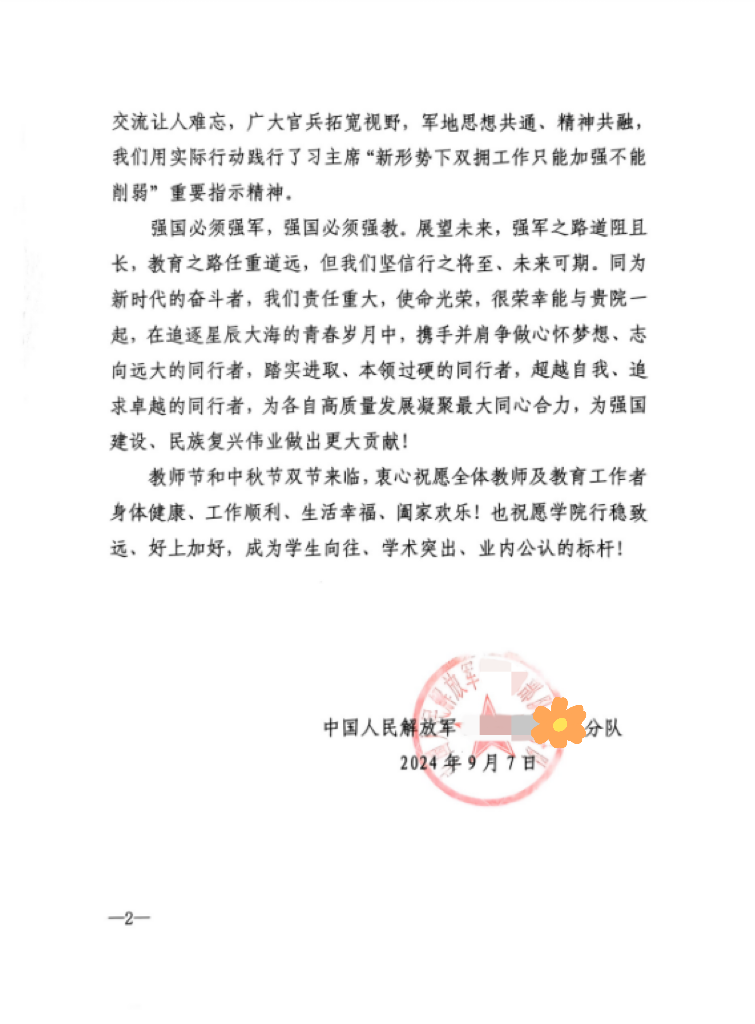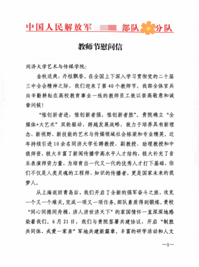 近日,艺术与传媒学院收到了来自海军某部全体官兵的慰问信。信中向辛勤耕耘在高校教育事业一线、致力于艺术与传媒教育的学院全体教师致以崇高的敬意和节日的问候,感谢学院师生通过一系列丰富多彩的人文交流活动,为海军官兵带去了精神滋养与文化洗礼,极大地丰富了官兵们的文化生活,加深了军民之间的深厚情谊。