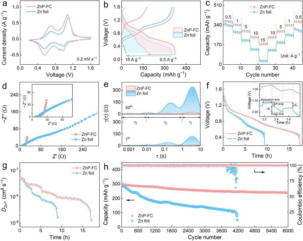 ZnP-FC负极和钒基氧化物正极耦合的全电池表现出高效的离子/电子转移动力学和超长的循环寿命。该研究工作为仿生锌粉阳极的结构设计提供了新的视角。