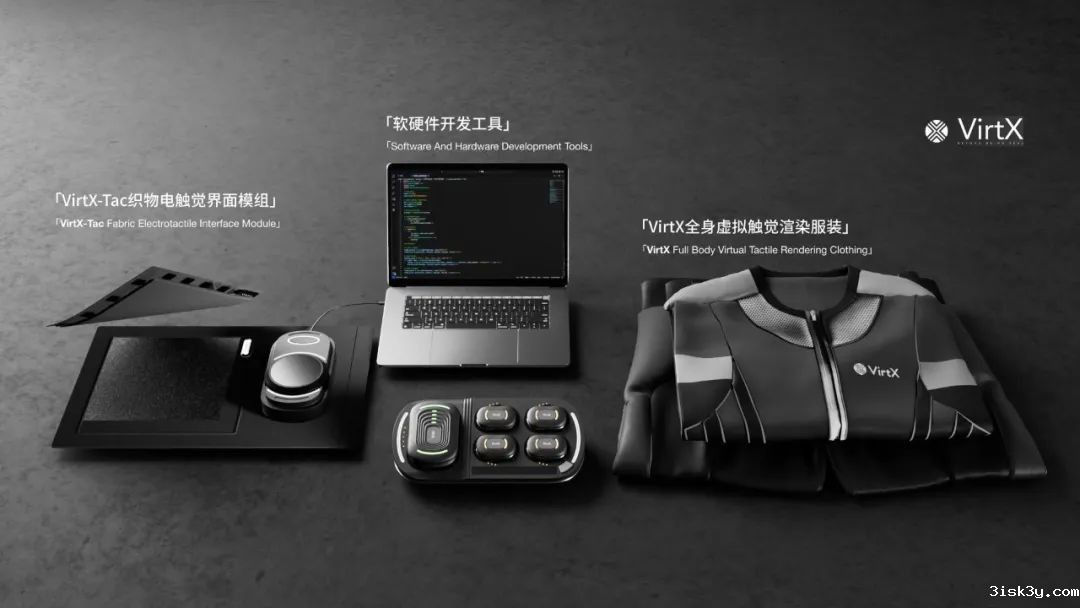 VirtX织物电触觉项目是通过多层编织结构的创新,将银纺线一体机织入布料中。布料制成服装后,通过自研的多电极控制架构高效控制全身数以千计的纺织电极,可渲染丰富的感觉类型及各类动静态触觉图案,分辨率最高达1mm,已超过人体98%以上的感受阈值。VirtX突破了XR设备不易使用的常态,做到了轻薄一体化,从外观到穿戴均与普通服装无异,轻巧的硬件驱动可直接吸附在服装上。为应对触觉设备开发生态薄弱,VirtX拥有一套完整的软硬件开发工具,十分有潜力构建或与现有XR生态接轨。未来,团队希望该项目能在娱乐、教育、医疗以及特殊场景中产生有效应用。