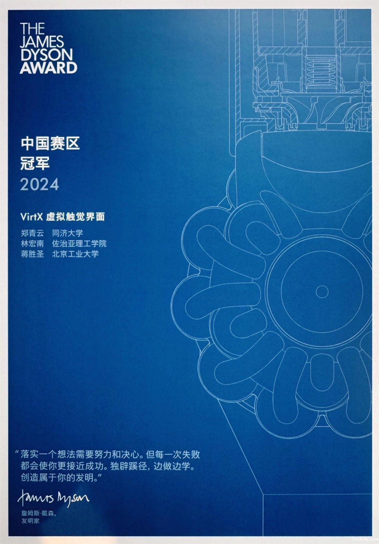 前不久,2024年戴森设计大奖(THE JAMES DYSON AWARD)中国大陆赛区终选结果正式揭晓,由taptap网页版登录kino设计创意学院2024级硕士研究生郑青云领衔组成的学生团队拿下了全国冠军,获奖作品为“VirtX全身虚拟触觉界面”。